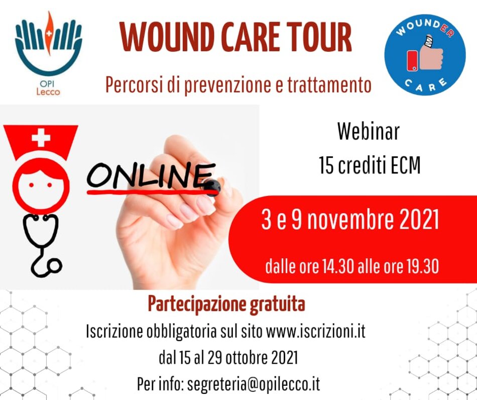 L'OPI di Lecco, insieme a WounderCare, ha organizzato il corso Webinar dal titolo: “Wound Care Tour: percorsi di prevenzione e trattamento", che si svolgerà in due giornate - 3 e 9 novembre 2021 dalle ore 14.30 alle ore 19.30. Il corso gratuito, è accreditato per 90 partecipanti, di cui 75 infermieri e infermieri pediatrici iscritti all’OPI di Lecco e 15 infermieri e infermieri pediatrici iscritti ad altri OPI e permetterà di acquisire 15 crediti ECM. Sarà possibile iscriversi da venerdì 15 ottobre sulla piattaforma www.iscrizioni.it