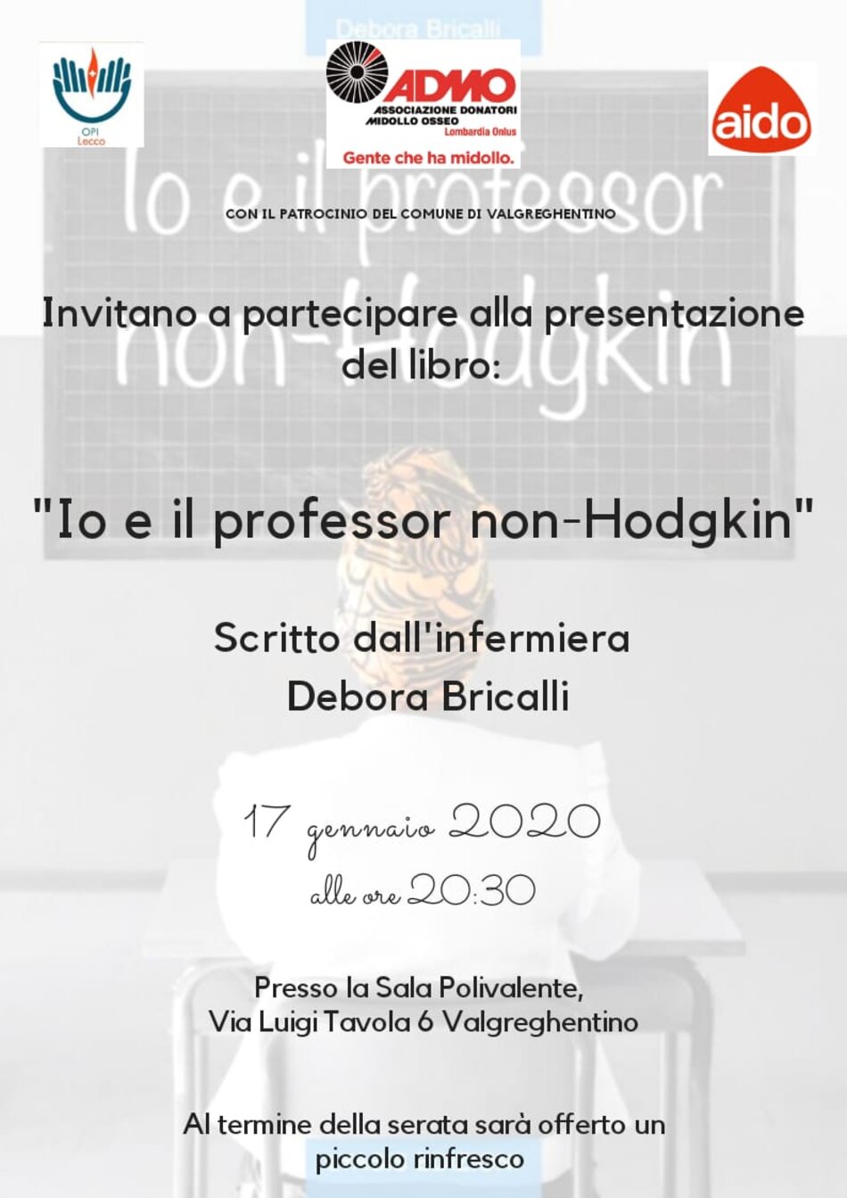 Il 17 gennaio 2020 alle ore 20,30 si terrà la presentazione del libro “Io e il Professor Non-Hodgkin”, scritto dall’infermiera Debora Bricalli.