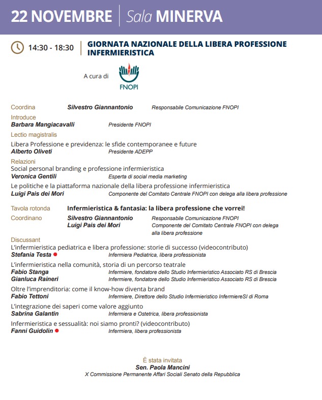 Si segnala l’evento “18° Forum Risk Management – La sfida della Sanità pubblica” che si terrà ad Arezzo dal 21 al 24 novembre 2023 ed in particolarela Giornata Nazionale della Libera Professione Infermieristica, inserita nell’evento, nel pomeriggio del 22 novembre dalle 14.30 alle 18.30 presso la Sala Minerva del Centro Congressi.Si rimanda al sito ufficiale del Forum www.forumriskmanagement.it per le iscrizioni individuali e per la consultazione del programma complessivo della manifestazione.